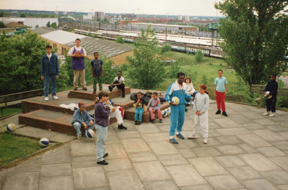 Kids being coached in how to play basketball. 1993