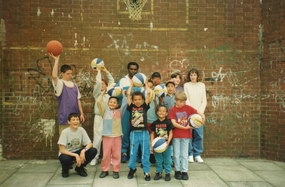 Kids being coached in how to play basketball. 1993